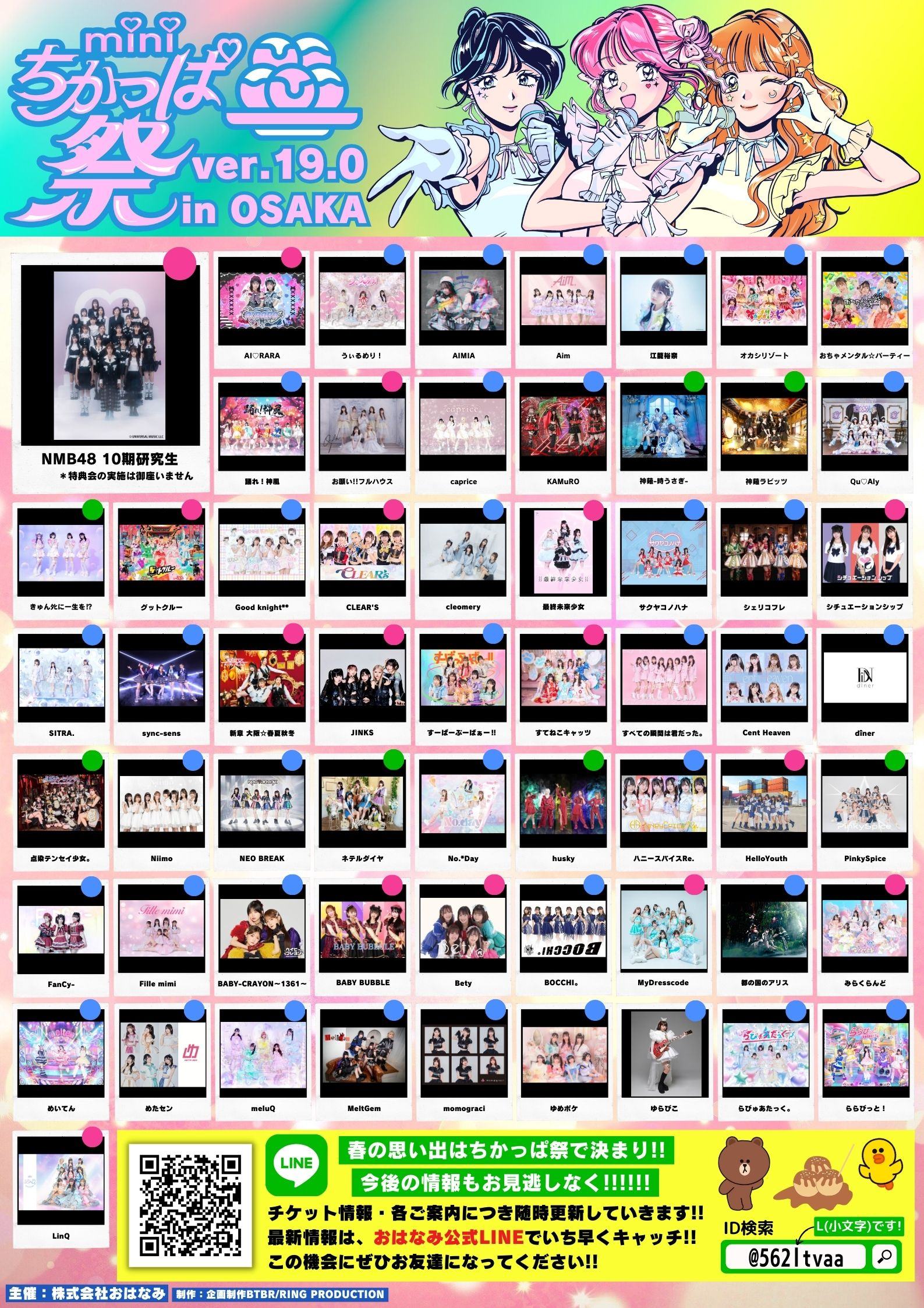 うぃるめり! / AIMIA / Aim / 江籠裕奈 / オカシリゾート / おちゃメンタル☆パーティー / 踊れ!神風 / caprice / KAMuRO / 神薙-時うさぎ- / 神薙ラビッツ / Qu♡Aly / Good knight** / cleomery / サクヤコノハナ / シェリコフレ / SITRA / sync-sens / すーぱーぷーばぁー‼ / すべての瞬間は君だった。 / Cent Heaven / dîner / Niimo / NEO BREAK / No.*Day / ハニースパイスRe / FanCy- / Fille mimi / BABY-CRAYON〜1361〜 / BOCCHI。 / 都の国のアリス / めいてん / めたセン / meluQ / MeltGem / momograci / ゆめポケ / ゆらぴこ / らびゅあたっく。 / ららびっと! / AI♡RARA / NMB48 10期研究生 / お願い!!フルハウス / CLEAR’S / シチュエーションシップ / 新章 大阪☆春夏秋冬 / JINKS / すてねこキャッツ / HelloYouth / BABY BUBBLE / Bety / MyDresscode / みらくらんど / LinQ / きゅんタヒに一生を⁉ / グットクルー / 最終未来少女 / 点染テンセイ少女。 / ネテルダイヤ / husky / PinkySpice
