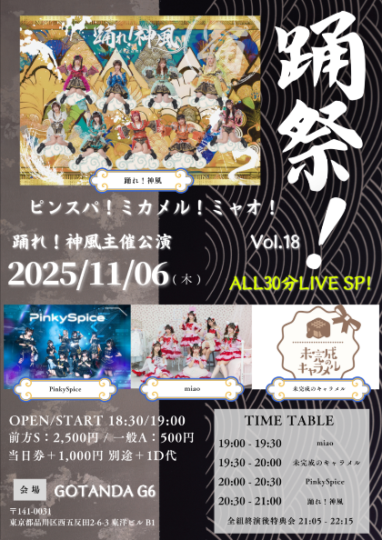 踊れ!神風主催踊祭!『踊れ!ピンスパ!ミカメル!ミャオ!』vol.18 🗓2025年11月6日(木) 📍GOTANDA G6 ⏰OP 18:30/ST 19:00 🎫前方Sチケット¥2,500円 一般Aチケット¥500円 […]